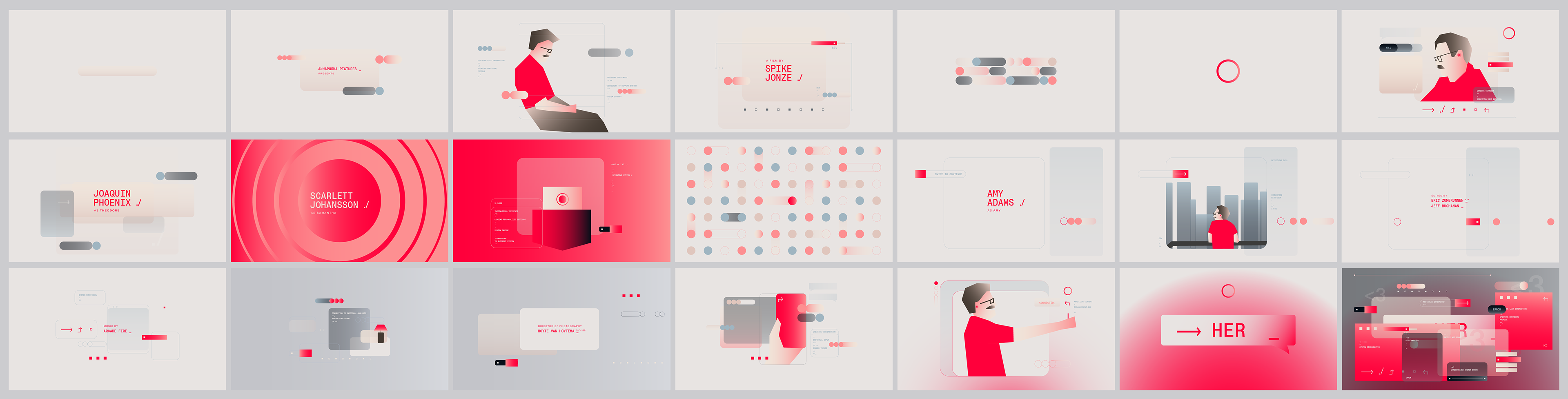 Where artificial connections create disconnection, technology steps in to occupy the emptiness in people. Title sequence design based on the film by Spike Jonze (2013).